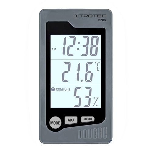 Лаконичный дизайн, настенное крепление, ножка для размещения на столе/полке и функция сигнализации делают термогигрометр Trotec BZ05 абсолютно незаменимым для спален, офисов и многих других пространств.Благоприятный микроклимат в помещении - это основная предпосылка здоровья и благополучия находящихся в нем людей. Два решающих фактора для хорошего самочувствия, температура и относительная влажность, указываются большими цифрами на хорошо читаемом ЖК-дисплее вместе с временем или датой. Кроме того, можно просмотреть записанные минимальные и максимальные значения. Также удобна встроенная индикация хорошего самочувствия: индикатор показывает, находятся ли значения микроклимата в оптимальном, приемлемом или критическом диапазоне для человека.